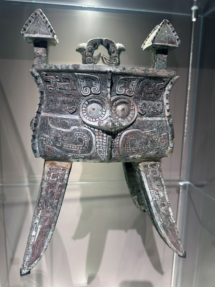 Wine vessel and cover, fangjia, with owl motif. Late Shang Dynasty (about 1550-1050 BC). Bronze, 30.7 cm high. Part of the Chinese bronze collection at Compton Verney. Photo: Sabine Casparie.