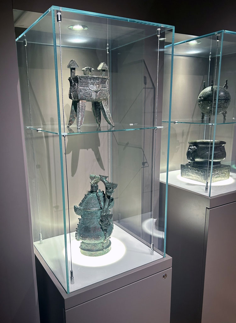 We stop in front of two intricately decorated bronze vessels with a luminous green patina, and So points to one in the form of an owl’s face, and the little worm on either side of it. “This is the Taotie, a mythological symbol found on many ritual bronze vessels, related to silk weaving.” I can see how this appeals to So, whose practice focuses on how historic symbols can be abstracted into new ideas and forms. “My interest in China and ancient Chinese culture is layered: the objects themselves, the mythology, the civilisation. And then on another level, there is the trade between China and Europe, and the exploitation.”