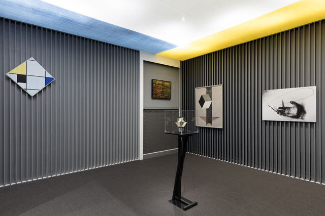 Apart from the functional objects, the exhibition features reconstructions of sculptures by several members of the First Working Group of Constructivists, such as Alexander Rodchenko, Karl Ioganson, Konstantin Medunetskii and Vladimir and Georgii Stenberg. Stepanova’s designs for Meyerhold’s production of The Death of Tarelkin and Aleksei Gan’s street vendor’s stand for Mossel’prom, both from 1922, add to this list. The most ambitious result of this undertaking is the reconstruction of two spaces – Rodchenko’s Workers’ Club, initially built for the International Exposition of Modern Decorative and Industrial Arts in Paris in 1925, and Lissitzky’s Room for Constructive Art, created in 1926 for the International Art Exhibition in Dresden. Both rooms are massive in scale, fitting the ample space allotted to the exhibition by the Art Institute, and allowing viewers to get a sense of what it may have been like to visit the original architectural environment. Although reconstructions can help the viewer to experience the spaces designed specifically for exhibiting abstract art and constructivist objects, the value of this experience may be questioned. True, it gives a general sense of objects’ location vis-à-vis each other and the viewers, but proportions or details of the actual manufacture may be not what the artist would have intended. It can be argued, as Gough did in her keynote lecture at the symposium Agitation for Freedom: Revolution and Its Avant Garde, at the Harriman Institute, that reconstructions of artwork may do more harm than good in being able to convey the general idea, but not the spirit of the work.
