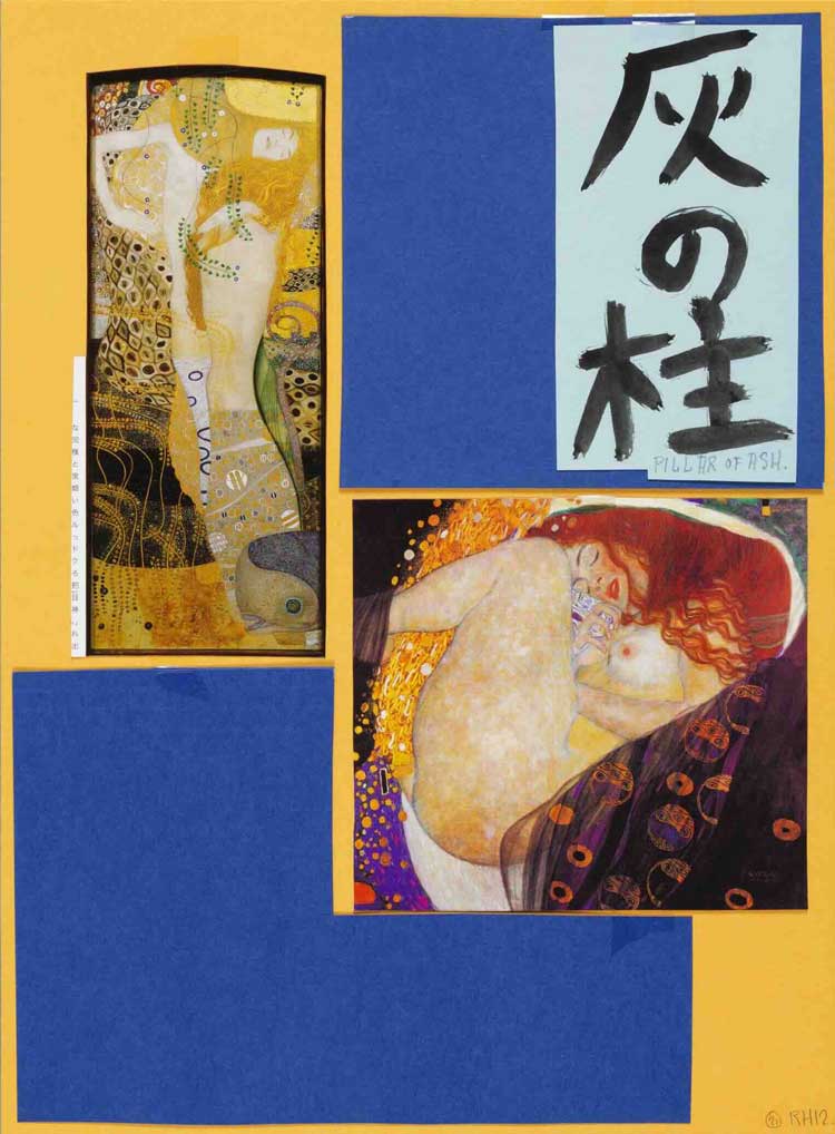 On the opposite wall is Hawkins’s Ankoku (2012) series of framed collages consisting primarily of facsimile pages of the scrapbooks of the Japanese choreographer Tatsumi Hijikata, the inventor of butoh, known as the “dance of darkness” since it was intended to channel death and decay. The images, incidentally, mostly consist of clippings of erotic paintings and drawings of (oddly corpselike) women by iconic Austrian modernists such as Gustav Klimt and Egon Schiele. Such dot-joining reminds me of the art historian Aby Warburg’s Bilderatlas Mnemosyne (1920s), a map of reproduced and collaged images from the history of art charting parallels and possible points of influence across time and place. For Warburg, aesthetic recurrences were a deeply psychoanalytic affair and not always conscious; as the art theorist Georges Didi-Huberman argues in his book on Warburg, originally published in French in 2002 – pertinently titled The Surviving Image: Phantoms of Time and Time of Phantoms – they could resemble a Freudian return of buried sexual urges.