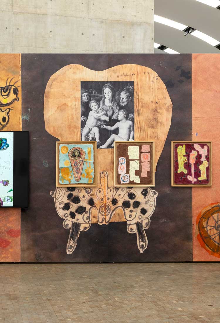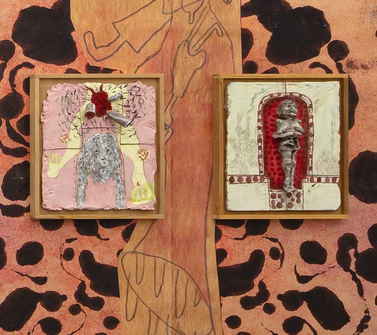 A more analytical approach is offered in After Artaud (2012-2020), a series dedicated to the playwright and drama theorist who sought to invent a “theatre of cruelty” based on non-western ritual that tapped into our unconscious. It comprises framed ceramic reliefs of emblem-like images of mortality and sex: a coffined skeleton surrounded by phallic forms, a pair of splayed yellow legs against a pink background with three bullets hitting the crotch, the bloody wound bearing horns and an angry face. These are said to be based on Antonin Artaud’s notebooks from his travels in Mexico in 1936, inspired in no small part by the hallucinogens Artaud was taking. Amid these is Hawkins’s film Being and Its Fetuses (2023), featuring footage of Mexican religious festivals from Sergei Eisenstein’s ¡Que Viva México! (1932) and a drawing – from Artaud’s notebooks – of what could be an effigy of female fertility, over which Hawkins superimposes a sequence of Renaissance depictions of the Virgin Mary breastfeeding her child.