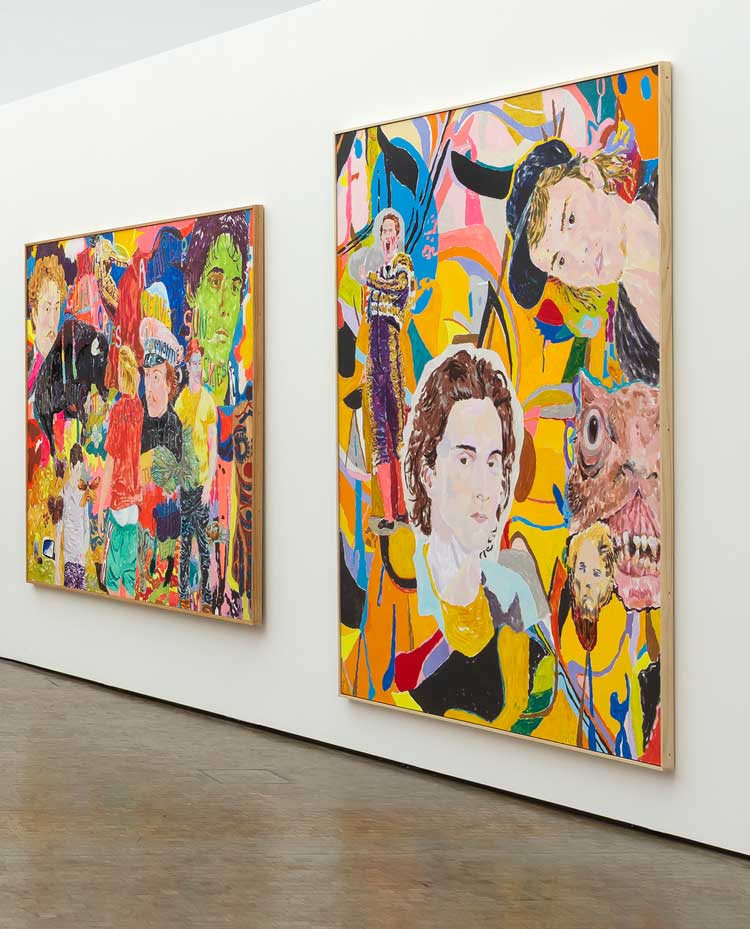 Right: Richard Hawkins, Left to His Own Devices, 2024. Acrylic on panel, 224 x 178 x 5 cm; Left: To Divide Him Vein by Vein, 2020, acrylic on panel, 178 x 223.5 x 5 cm. Installation view, Kunsthalle Wien 2025. Courtesy the artist; Galerie Buchholz, Cologne / Berlin / New York and Greene Naftali, New York. Photo: Markus Wörgötter.