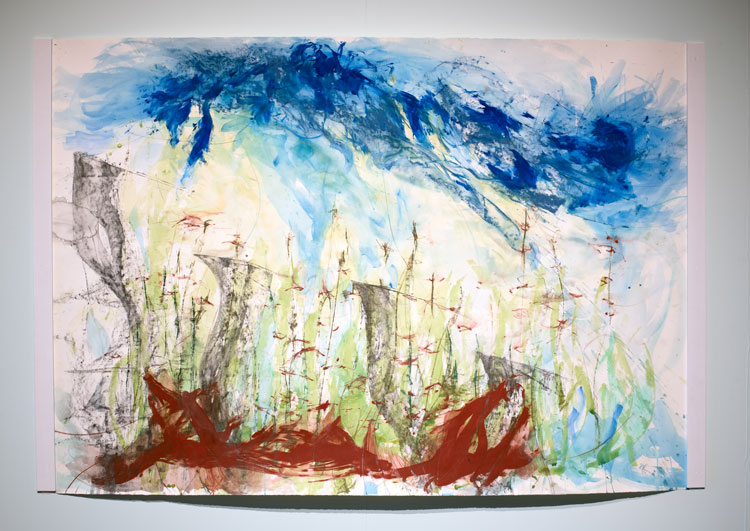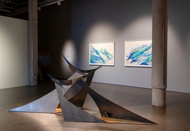 Identifying as non-binary, Robertson is interested in “the spaces left empty by oppressive systems” and rigid categorisation, and the more fluid environments of nature. Their most recent work includes steel sculpture – often curved and painted – and large, colourful abstract drawings, often made within the landscapes or beside the water they evoke.