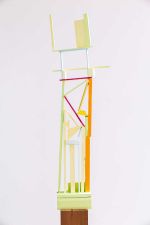 Running concurrently with Slim Glimpses at Cample Line is Rowan Mace’s exhibition Time’s Light. Mace’s sculptures populate the airy upstairs gallery while some of the smaller pieces occupy the bookshelves downstairs. Mace is based in Glasgow but was born and grew up in Cornwall. It is obvious to wonder whether her preoccupation with changes in the light has its origins in the Cornish landscape, or the work of the St Ives School of artists whose mid-20th-century abstraction was inspired by that same landscape. Mace works with wood to build structures that she then paints. She explains a seasonal process that means she builds her wooden structures in the autumn and winter when light is at a premium, and then paints them in the spring and summer when light is in abundance.