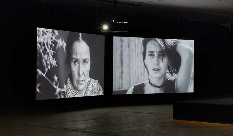 At the front of the gallery – forming an introduction, in a way – is the earliest of the films, Zukhra (2013). As I enter, I see a woman lying on a bed, peacefully. It is not clear whether she is sleeping or even alive, whether it’s a film or a still. Slowly, if you pay attention, you can see her breathing. Eventually, ghostly images of a young man appear, fragments of text float across it. The projection screen is suspended in the room so that you can see it from both sides.