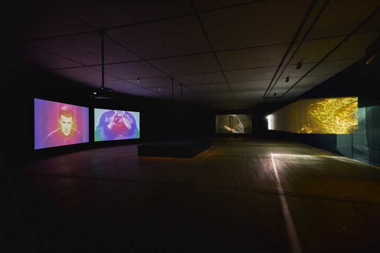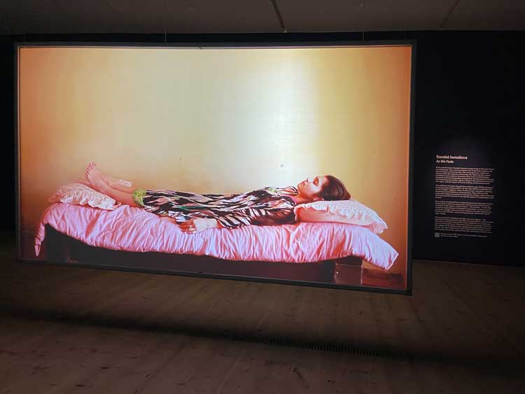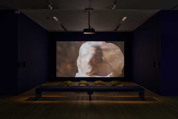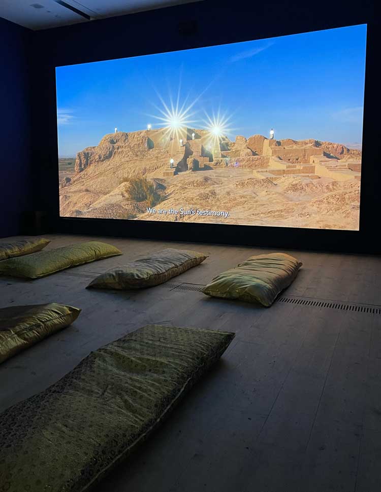 We take a step back into ancient mythology and a more linear narrative with the film at the far end of this long gallery, Melted into the Sun (2024). It relates the life and actions of al-Muqanna (The Veiled One), an eighth-century mystic from Khorasan. He fought against the Abbasid empire, espoused proto-socialist ideas and used magic and ritual in his practices. The film includes scenes shot in key places in his life: the banks of the Amu Darya River, the Zoroastrian fortress of Kafir Kala, a round burial ground called Chillpiq, and the city of Bukhara. But you don’t need to know any of this historical detail to enjoy the sumptuous imagery, the screen filled with golden autumn leaves and sun-burnished landscapes. Gold re-emerges often. A priest-like figure (presumably al-Muqanna) holds his hands up to the sky, his fingers appearing to have been dipped in gold. Bodies and clothing are backlit by the sun. Figures standing on what look like the ruins of an ancient temple flash mirrors at the sun. A promenade of people with white gauzy veils pinned to their faces by the breeze, stare up at the sun. A plane tears across the sky – its contrails streaking white lines across the blue. It all proceeds at an exquisitely slow pace. The film’s meditative rhythm generates a sense of calm and stillness, and complete receptivity to these seductive images. Long, ornate beanbags are laid out in front of the screen for extra comfort. They look a little like sleeping bags – or body bags.