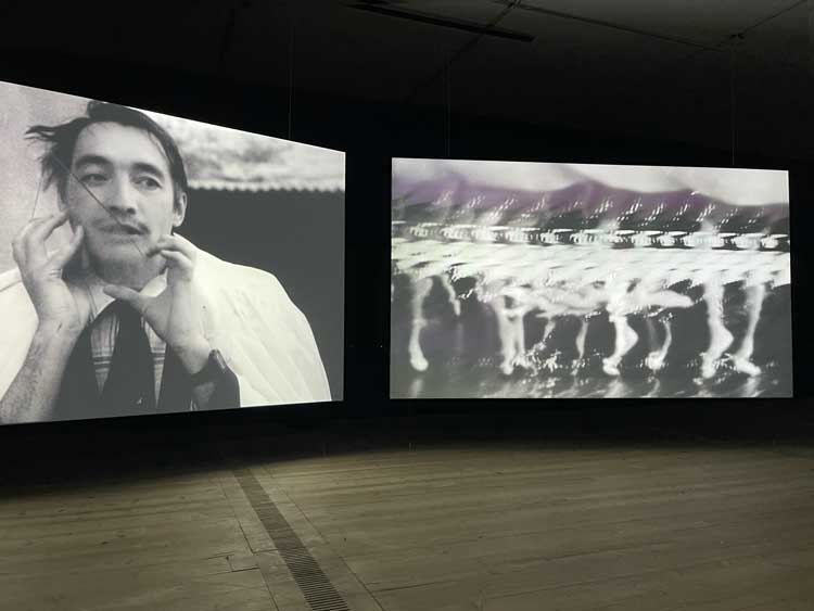 There is a new film commission for this show, Swan Lake (2025). I admit I was hoping to see ballet dancers – especially when I learned that the film was inspired by a 24-hour period in August 1991, in the run-up to the USSR’s collapse, when a (failed) military coup triggered a panicking Soviet state TV channel to play the ballet on a continuous loop. But there is no sign of dancers on the screen. Instead, I see pale, tormented faces in black and white staring into the distance, their eyes filled with apprehension. Weaving across two screens, Swan Lake features a collage of clips from a huge array of films made in the period of the collapse of communism (roughly 1989 to 1992), all in black and white. I sink on to a handy bench to observe the 30-minute spectacle. There are a few repeating motifs: the face of an old man, in peasant dress, staring across a field of wheat, the light behind him. Another man – an intellectual, we assume (he is bald, bearded and wearing glasses and a clean, white suit) – wanders around an unfamiliar landscape, and is then shown lying on the ground. Is he dead? A distraught young woman steps barefoot around him. They are in an abandoned building filled with leaves. You can hear the leaves crunching. We see hands milking a goat, and then the camera shows the milk that’s squirting out of the goat’s teats spraying on to bare ground. A hypnotist on a TV screen is counting slowly. Mostly, the juxtaposed images on the two screens are not directly related, though they are adjacent and overlapping in all kinds of interesting ways. For example, at one point we see the naked upper half of a man sliding, on his back, into some kind of machinery (a medical scanning machine?) as giant hands on the screen to the right slide up and down a set of controls – perhaps graphic equalisers? Later, on the left screen, a crowd of people appear frozen on camera, eyes closed: we zoom up close into their faces. Is this a still? No, they are motionless while the world goes on about them, according to the right screen, which pans out to reveal the same crowd standing like statues, in what looks like a petrol station, while traffic flows past them on a multi-lane highway. There are many images portraying people asleep – curled up in bed, burrowing under duvets, a peasant woman in a headscarf asleep on a cushion. Are they in limbo? Or is this paralysis? Suddenly, a burst of Tchaikovsky’s Swan Lake is heard, only to be drowned out by a pulsing 1980s disco soundtrack as we segue to the interior of an 80s nightclub, and three characters, wearing horse’s heads as hoods, walk towards us. We see briefcases, helicopters, a gun being loaded. Then a young woman, wearing ear defenders as for a firing range, lifts her arm, holding the gun, and shoots. The face of a woman wearing a veil looms towards us. As the veil flickers in the wind, her eyes fill with tears. Then she opens her mouth and – in the only moment of colour in the whole sequence – flames flicker and burn as in a furnace. Twice these words appear: “We were led to believe that humiliation and lack of rights were to be accepted without opposition.”