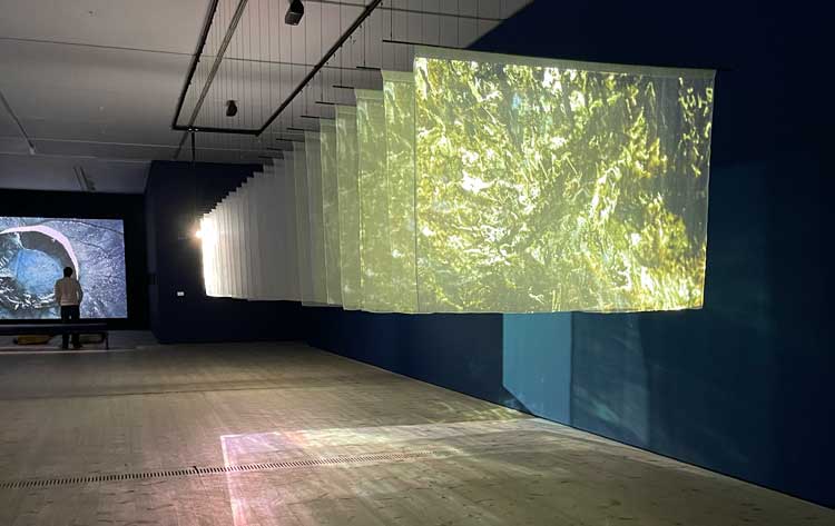 As We Fade (2024), which was shown in Milan, lines the wall opposite Swan Lake, occupying its own shimmering, sculptural space. It is a film projected on to 24 panels of silk gauze, the light from the projector beaming on to the front panel and percolating through each one, refracting on to the floor from time to time. It is filmed on Mount Sulaiman-Too Mountain, a place of Muslim pilgrimage in Kyrgyzstan, and includes archival footage from 1929. The 24 panels are apparently a reference to the format of cinema – images unspooling at 24 frames a second – but it is hard to capture what is hidden between each frame, each panel. The images are elusive, mysterious, as you move around this filmic installation. Someone is climbing inside a cave and there are figures creeping across rocks. Presumably the mystery and impossibility of trying to grasp what is being shown is the point.