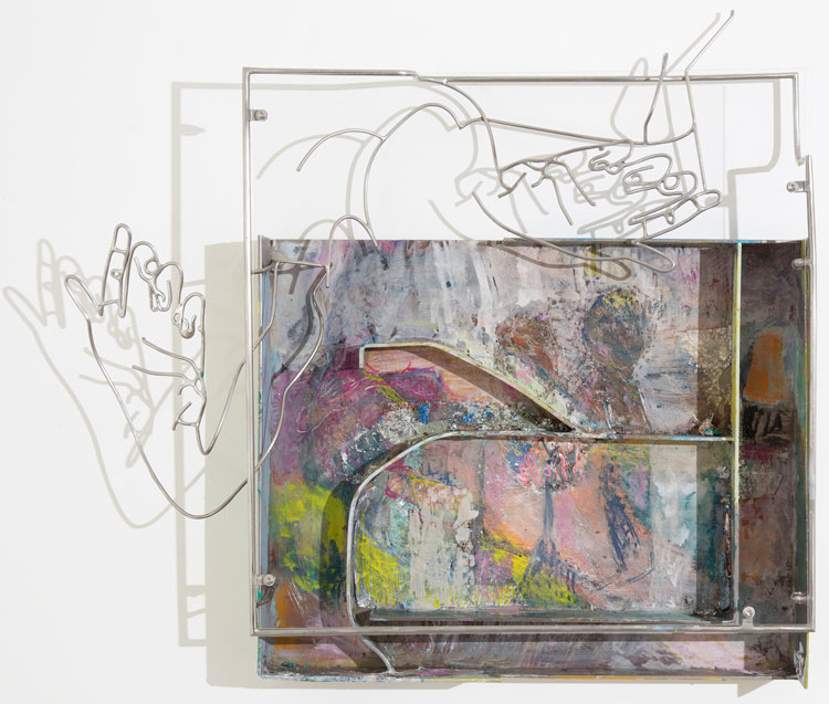 Sara Barker. JOINT, 2020. Stainless steel tray, stainless steel rod, automotive paint, oil paint and stick, varnish, tinfoil perspex, 60 x 49 x 9 cm. Photo: Mike Bolam.