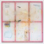 The wall piece Untitled (Roy Orbison), is another example of Jeffrey’s enjoyment of mixing and manipulating materials. The pink painted stretcher forms frames as it shows through the largely transparent polyester (bought by Jeffrey from a Turkish market in Berlin). A small photograph of Roy Orbison – the top of his head and his dark glasses – is collaged behind the polyester, prompting us to sing quietly, “Only the lonely – dum dum dum dum didlyah daa …” These large and engaging works are tantalisingly haptic – the temptation to press the polyester surface of Untitled (Roy Orbison), or run your fingers over the vigorous scrapings that cross a palimpsest of materials on some of the other wall pieces, echoes Jeffrey’s own response to the world through making. “The power of these works is in their accidental transcendence, the tension between the virtuosity of the artist and the lo-fi, reclaimed materials employed.”2
