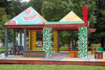 SC: No, this project was not so deeply tied to any concept in particular. I was invited to do something in two very different places: Womad is a music festival that is not set within any particular art context, while the Folkestone Triennial is totally within the art context. I wanted to put into practice more of the social aspect of my installations, because I do these shows to have some sort of social interaction. Some of them are more successful than others because it always depends on the space or the organisation as to whether you have any social activity. For Casa Anacaona, I thought it would be interesting to do some sort of exchange between the venues. My idea was to bring the art to the festival and the music to the triennial. I wanted to establish a collaboration with people in Folkestone that would travel with me to Womad, to continue this work at Womad, and then to go back to the final position of the installation in Folkestone for three months – and it worked out very well, I have to say. Things obviously changed in ways I didn’t expect, because we were working with so many people. I worked with a group of young creatives – aged between 23 and 25 – in Folkestone. The town has the classic problem of all small towns everywhere, in the UK or any other country, where young people are leaving to go to the city. But these guys are still there, and they’re willing to live in Folkestone, they’re figuring out what they want to do. Some of them study art, and a couple of them were young carpenters, but some of them didn’t even know how to use a saw. We all worked together for a month in Folkestone to build the house. I designed the whole project before going there, of course. Then we had some professional carpenters in to build more of the heavy parts of the structure because it obviously had to be safe. We built the furniture and the decorative elements of the structure. Then the team travelled to Womad and we built it again there. During the festival, we held painting workshops. We had saved all the leftover wood from the construction and we cut it into different shapes. I tried to do some marine-like sea motifs, because the installation in Folkestone is going to be next to the sea, but they are so abstract that they don’t look like anything, really! The people at the festival made small paintings using the cut-outs, and I screwed them to the structure. They helped us finish decorating the pavilion.