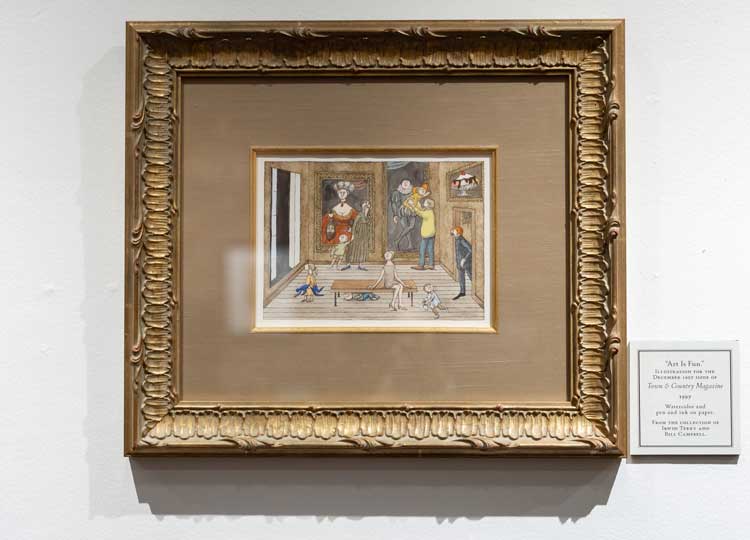 One of the outstanding works in the exhibit is the promotional piece for Bantam Books’ 1995 summer reading programme that depicts a gaggle of clueless garden partygoers unperturbed by a skeleton calmly reading a book in a hammock. Unfortunately, Gorey’s colour sense at its best was hesitant. He daubed his drawings within the penny plain and twopence coloured tradition of 19th-century popular prints and toy books. They are never any more than coloured drawings. Gorey was not a painter. He thought in line, not colour. Arguably the most beguiling and endearing Beardsleyesque watercolour here is the New Yorker cover, submitted in 1992 but not published until 10 December 2018, that shows two lazy cats lost in the folds of a chintz-covered bed. Gorey’s true medium was pen and ink. The Society has made a grave error in not allocating the show to a proper full gallery but instead hanging the pictures near the bar on the third floor. (There is no elevator.) While it is a more intimate setting in keeping within Gorey’s claustrophobic sensibility, one must nevertheless squeeze between or climb over couches and other furniture or on stairs to study the intricacy of the drawings. Something Else Entirely may be small, but it is still a highly rewarding show. It has turned out to be the most popular exhibit the Society of Illustrators has ever displayed. Gorey would have been flummoxed and then finally flattered by this extraordinary response to his art.