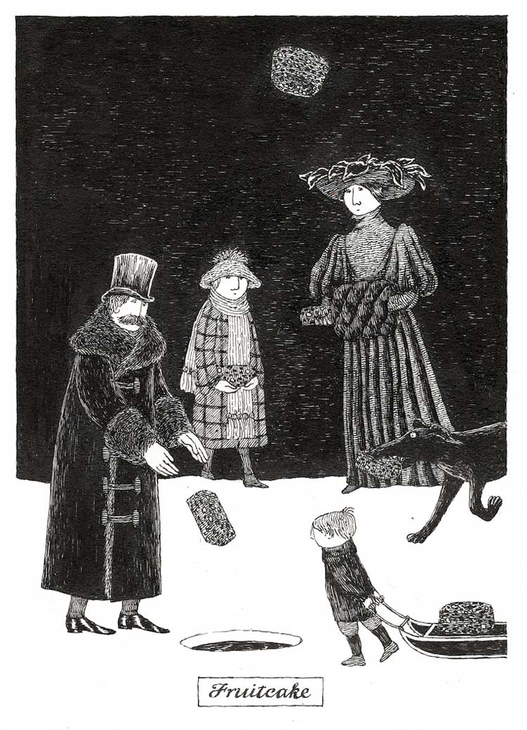 Fruitcake. Art for limited edition Christmas Card, 1990. Pen and ink on paper. Albondocani Press. From the collection of Irwin Terry and Bill Campbell. Courtesy of The Edward Gorey Charitable Trust
