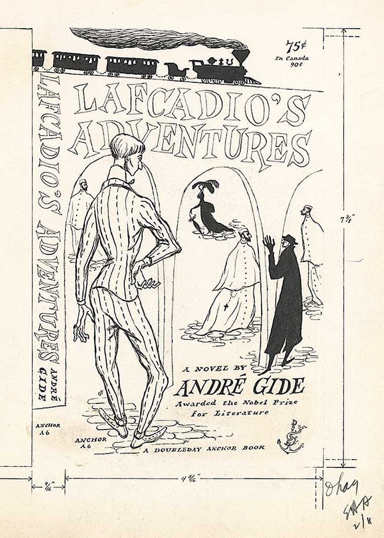 Cover art for Lafcadio's Adventures by Andre Gide, 1953. Pen and ink on board. From the collection of the Edward Gorey Charitable Trust.