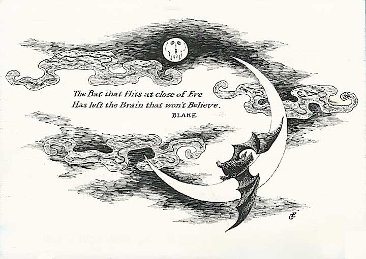 Designs for book jackets and covers, postcards, flyers, posters and magazine covers and other ephemera dominate the display. (None of the odd record album covers are included.) The current show represents his early Harvard years up to the very last illustration he ever published, for a review of the Fashion Institute of Technology’s exhibition The Little Black Dress and Other Signs of Status, in the New Yorker on 27 March 2000, a wild mishmash of trends in dress of the last century. One of the earliest of the drawings in the show is Gorey’s imagined portrait of the Roman Emperor that appeared on the cover of Marguerite Yourcenar’s Memoirs of Hadrian (1954), so exquisitely rendered in pen and ink in the classical manner. Several pictures, such as the easily identifiable Fruitcake for Christmas 1990, The Skating Party in the New York Times Book Review (2 December 1990), and the ebullient National Postcard Week of 1993, represent Gorey at his finest and most Goreyesque. One of the most delicate of his pen-and-ink drawings is the haunting cover design for the November 1966 issue of the Kenyon Review in which a bearded gent, apparently a poet, is visited by his vaporous sylphlike muse. Most startling and unexpected is the revelation that he once illustrated something by William Blake with a moody drawing of a bat flitting between a crescent and a skull-faced full moon for Auguries of Innocence in 1975.