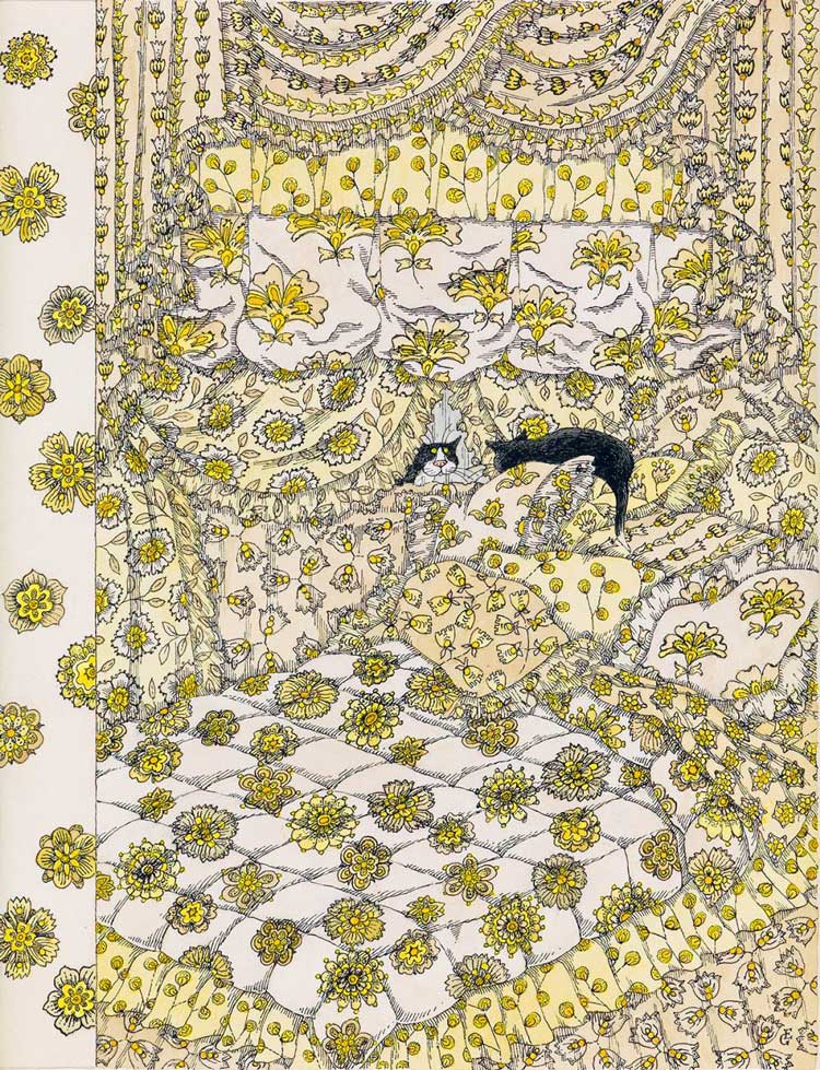 He submitted poems and stories to the undergraduate literary magazine Signature, drew covers for the Harvard Advocate, and earned a degree in French literature in 1950. He had already gone through most of the 19th-century English classics (“I feel most at home in that genre”); and “I figured nothing in the curriculum would advance my career, so why not take French?” He thought the department was lousy. Nevertheless, the surrealists in particular inspired him. “I sit reading André Breton and think, ‘Yes, yes, you’re so right,’” Gorey gushed to writer Jane Merrill Filstrup in the Lion and the Unicorn in 1978. “What appeals to me most is an idea expressed by [Paul] Éluard. He has a line about there being another world, but it’s in this one. And Raymond Queneau said the world is not what it seems – but it isn’t anything else, either. These two ideas are the bedrock of my approach. If a book is only what it seems to be about, then somehow the author has failed.” Although he did not share the French painter’s sexual preferences, Gorey also adored Balthus (whose drawings he collected) through their mutual interest in cats. He also liked the Englishmen Francis Bacon and Edward Bawden.
