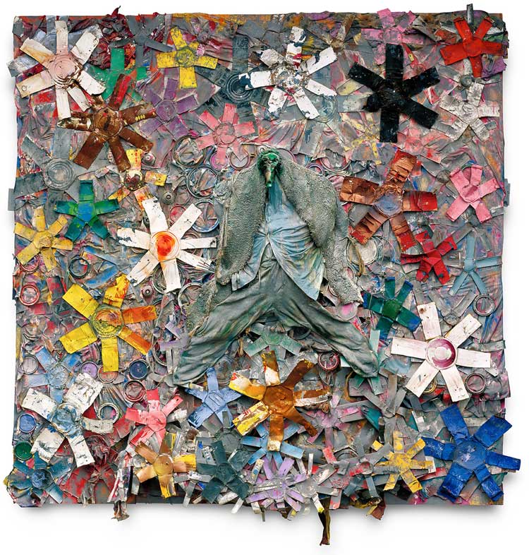 In Dial’s Stars of Everything (2004), a downtrodden American eagle dressed like a tramp protrudes from a colourful constellation of stars made from splayed paint cans; a self-portrait of sorts, it speaks to the artist’s enduring belief in art, despite being ignored by an indifferent art world. For Dial, birds denoted freedom and autonomy, yet such liberties are denied to the lifeless creatures in his collage Blue Skies: The Birds that Didn’t Learn How to Fly (2008), which depicts a row of dead blackbirds made from scraps of fabric hanging from a washing line. It is a haunting work, evoking the horrific lynchings and racial intimidation suffered by African Americans during the Jim Crow era. Though attesting to a specific moment in the troubled history of America, it speaks of a continuing struggle for justice that resonates beyond the deep south.