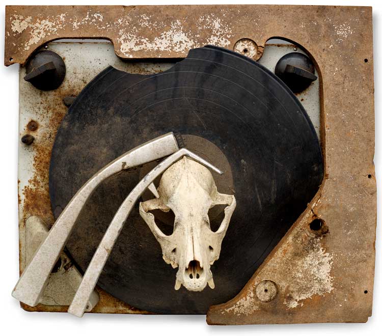 Lonnie Holley, Keeping a Record of It (Harmful Music), 1986. Salvaged phonograph top, phonograph record, animal skull, 34.9 x 40 cm. Souls Grown Deep Foundation, Atlanta. © 2023 Lonnie Holley / Artists Rights Society (ARS), New York / DACS, London. Photo: Stephen Pitkin/Pitkin Studio.
