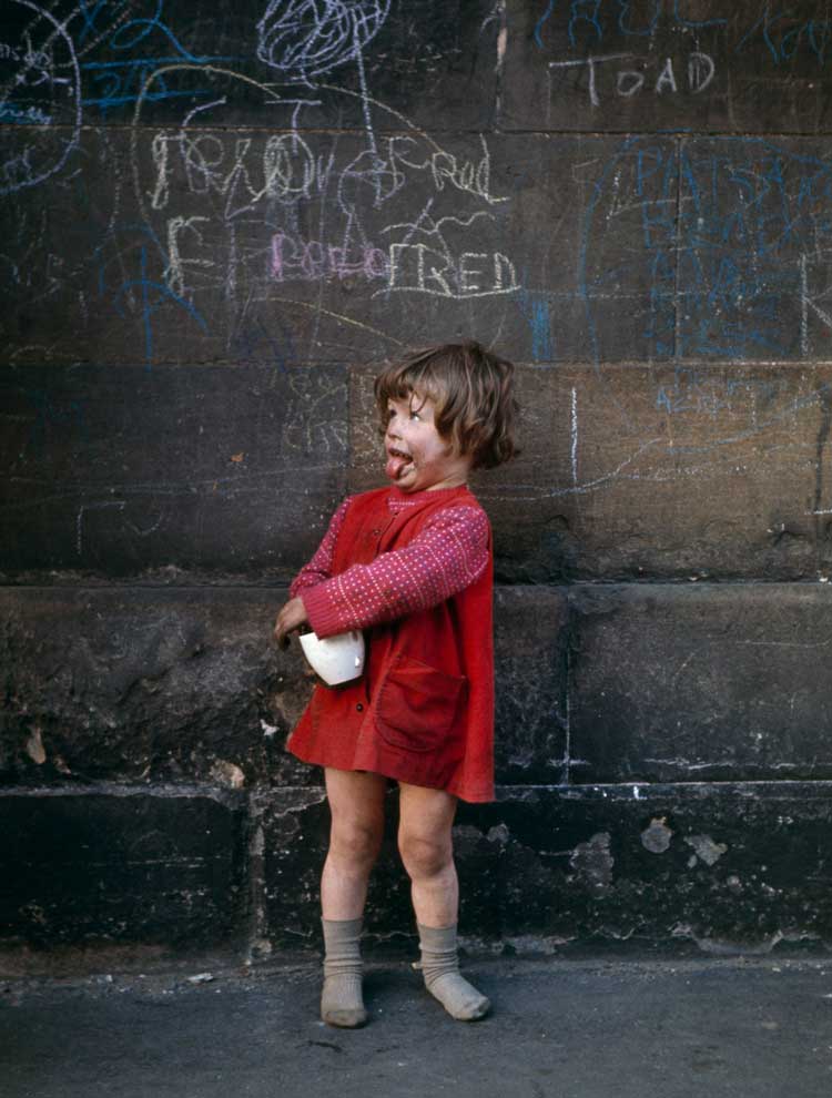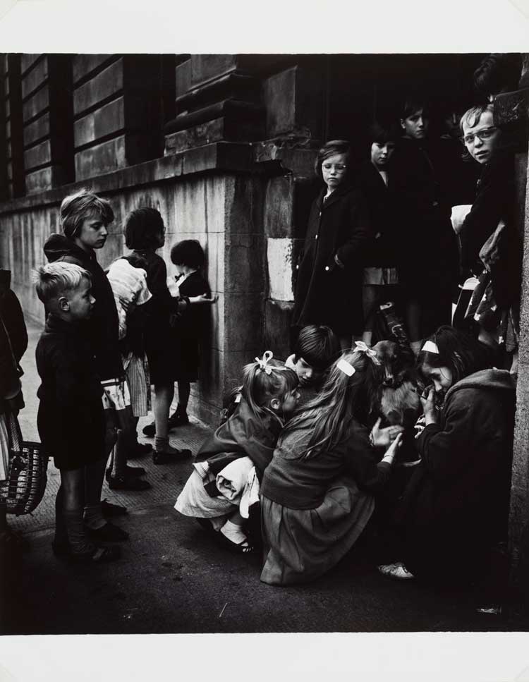 Children and poverty are common subjects in this exhibition and it is not just the domain of Marzaroli. Hardy’s The Gorbals Boys and Untitled – Two Girls Sitting by Kitchen Sink, both from 1948, give a slightly early view of such subjects. Joseph McKenzie’s Gorbals Children and Girls Petting Dog (both 1964-65) provide yet another view contemporary with that of Marzaroli. Eric Watt’s Girl at Chalk-Marked Wall (c1960s) is an unusual example in colour from this period.