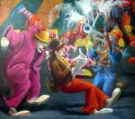 Sue Contreras's early paintings did not depict masked figures. In fact, they chronicled aspects of typical American life that were slightly offbeat, mostly in a humorous way. In the 1980s, many of her paintings depicted circus scenes or carnivals, as in 'Good News' of the mid-1980s (oil on canvas), or carnivals, as in 'Magic' (1988, oil on canvas, 62' x 79') and 'Carnival Goldfish' (1989, oil on canvas, 78' x 58'). 'Good News' presents the clowns of the circus doing their thing in quirky poses that tempt circus goers to laugh, as at the clown pretending to sit without a seat under him and read the newspaper with all sorts of circus activities taking place around him. 'Magic' depicts the fire eaters, oriental spirit figure and dragon masks, and other masked or costumed figures functioning in an atmosphere with more mundane figures, such as a man with a cane nonchalantly walking through the scene carrying a plastic bag of water with goldfish in his left hand, and a partial figure of a passerby breathing out smoke, apparently from a cigarette, taking in stride the magical goings on around him. 'Carnival Goldfish' is filled with colorful types of the midway of a carnival and its cotton candy, snow cones and goldfish in plastic bags. To create her chronicled episodes from daily American life, Contreras used photographs as a reference and sometimes friends as models.