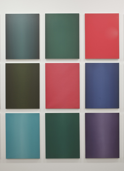 The utopia of conjoined nations, together in the same place, is a constant topic in Najd’s works. Painting a world of flowers she combines rigorous figurative creation with a highly conceptual image that is overflowing with abstract meanings. Is there any real relation between national icons and what they represent? Questions like this configure the Non Existence Flag Project (2010-12), which includes the Grand Bouquet. If in this painting the national icons are meticulously cultivated to stand out in a floral portrait, in the other artworks that compose the Non Existence Flag installation Najd erases the lines and contours that would shape the symbols of more than 100 national flags. The process consists of isolating their design elements in order to calculate the percentage of each colour that constitutes the flag. She repeats the process for each country. Similar to a chemical approach, she mixes the colours in their correct proportions until one single colour emerges. The final result is a set of monochromatic paintings generated by real flags whose colours were dissolved. She hangs these monochromatic paintings side by side, like a line of flags that only contain the pure blend of each nation.