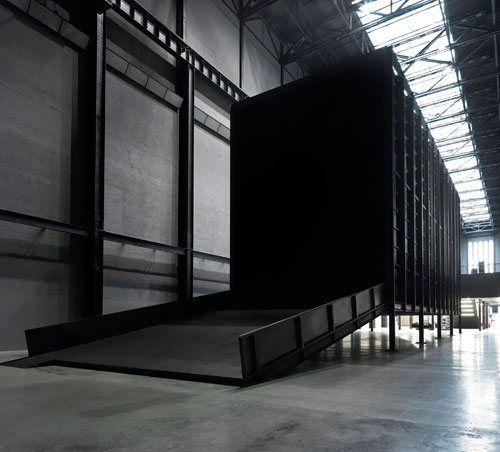 The current Unilever artist, Miroslaw Balka, has also created an environment, but instead of creating something visual, or even visible, he has made a work using light-absorbing material across the walls of a storage container, for the purpose of experiencing darkness. How it is (2009) is an empty container running about half the length of the Turbine Room, and with the height of cathedral proportions. You enter the space by moving up a ramp and into the container, and as you walk into this space, you see a vast and dense field of impenetrable blackness ahead. As you plunge into the darkness you momentarily find yourself unable to see, although arguably you might be said to perceive darkness. You can, however, feel the sides of the container, and experience those sides to be of a soft material. And you can hear the sounds made throughout the space, as well as those produced in the Turbine Room. By denying, or reducing, the viewer’s visual perception, this piece, in effect, enhances the observer’s auditory awareness. At the far end of the work you are in a position to benefit from the full effects of the darkness, if you remain with your back to the entrance. It is at this point that you can experience the sounds most fully, as when they reflect off the container’s surface; and you become aware of the sharpness of the echo and the relation between the staccato sounds heard within the container and the softer and more reverberant sounds produced outside of it.