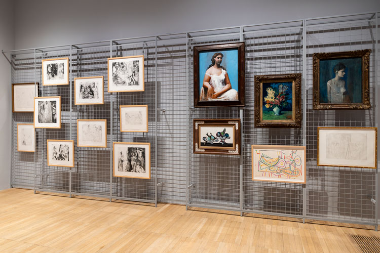 During this preview, which was already much more than a press tour, we were greeted by Picasso in a pink shawl, pretending to be Carmen with a cigarette in his mouth, before we followed the director and curator into the first room, which had been made to look like the back room of a museum, with paintings and etchings hung on metal screens as if in storage. If this was backstage, then the next room functioned as the wings to a great stage, where I noticed Faun Revealing a Sleeping Woman (1936), where the curtains and shadows of the woman’s bed recollect the curtains of a stage, as well as hinting at the fine line between dreams and consciousness, real life and plays.