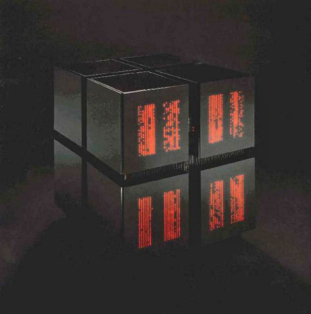 Another striking example in this exhibition of a computer as machine art is Diab DS-101 Computer, designed by Richard Hamilton for Ohio Scientific in 1985-1989. Hamilton, who is widely known for being a member of the London-based Independent Group in the 1950s and author of the famous pop art collage from 1956 Just What Is It that Makes Today’s Homes So Different, So Appealing?, which criticised postwar consumerism, displays his interest in computer technology as a possible counterforce to mass culture. Ernő Rubik’s ubiquitous Rubik’s Cube (1974) is another reminder of a cultural link between pop culture and computer age.