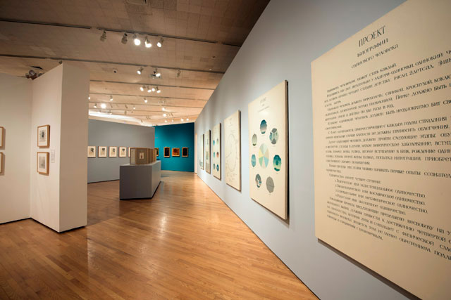The unwinding of the title requires some attention, as it allows us to discover the show’s logic. First, in 1979, art critic Boris Groys published an essay entitled Moscow Romantic Conceptualism, coining the name of the movement in the process. At the beginning of the essay, he acknowledged a certain “monstrosity” of his verbal creation, but defended it by accounting for the fact that, in Moscow, artists reached the stage of making conceptual art, both visual and verbal, by incorporating critiques of their works’ conditions of possibility into their form. As a result, the new art became transparent for comprehension, but it was still tied to Russia’s “collective unconscious”, which lent it a certain “mystical”, “religious”, and “Romantic” quality. The combination of conceptuality and romanticism led Groys to introduce the label by which the movement was known for several years. By the beginning of 2000s, as the Russian collective unconscious was slowly disintegrating in the arts, and migrating to the domain of the state-supported church and religion, the second stage in conceptualising the movement was reached. The epithet “romantic” disappeared from references to it, attested by the title Moscow Conceptualism in Context, a pioneering book on the subject published in English by Alla Rosenfeld, an art historian and former curator of Russian and Soviet non-conformist Art at Zimmerli.
