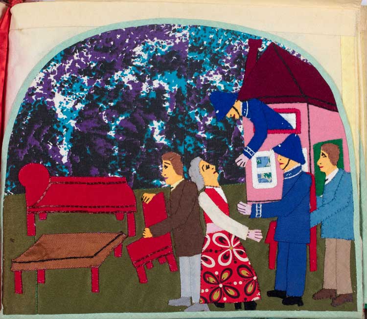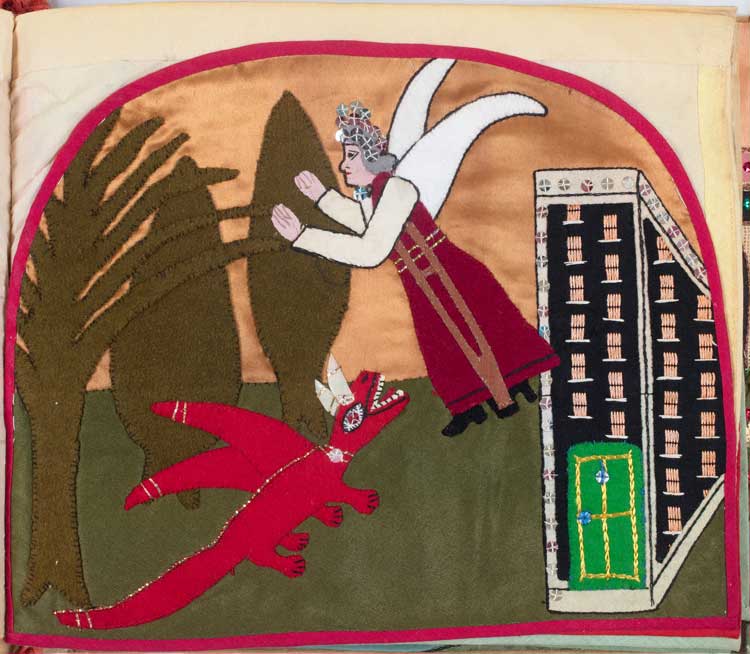 In 1961, Queen created her masterpiece, Autobirragraphy – a textile book, with pictures, depicting scenes from her life, and accompanying handwritten words, Bible verses, calculations and prophecies (including her prediction that the world would end in 1996). The title is a pun on her works, which she called “rag pictures”. The best thing about this book is that, unlike with her individual pieces, there is no discolouration caused by the paraffin fumes from her cabin.