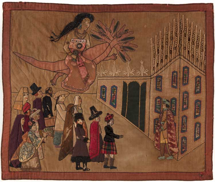 Bridget described how Queen would sit on the couch, which served as her bed at night, and made pictures on her knees, cutting a shape straight out of the cloth, not using any template. As Queen worked, Bridget would read to her from the newspaper, and they listened to the Home Service on the radio. The Black Feet Are Kicking (exhibited 1966) again shows how Queen is influenced by contemporary world news as she mixes a biblical story with her response to a report on the radio celebrating the independence of African nations. It is executed entirely in black fabric on a creamy-white ground, apart from the sequins on the heads of the figures and their thread necklaces. In the top right-hand corner, a sequin eye looks down from a large brick-like object. Queen would have seen this loss of British colonial territory as fulfilling the prophecy that a large stone would fall on a succession of different empires, from the apocalyptic writing in the book of Daniel.