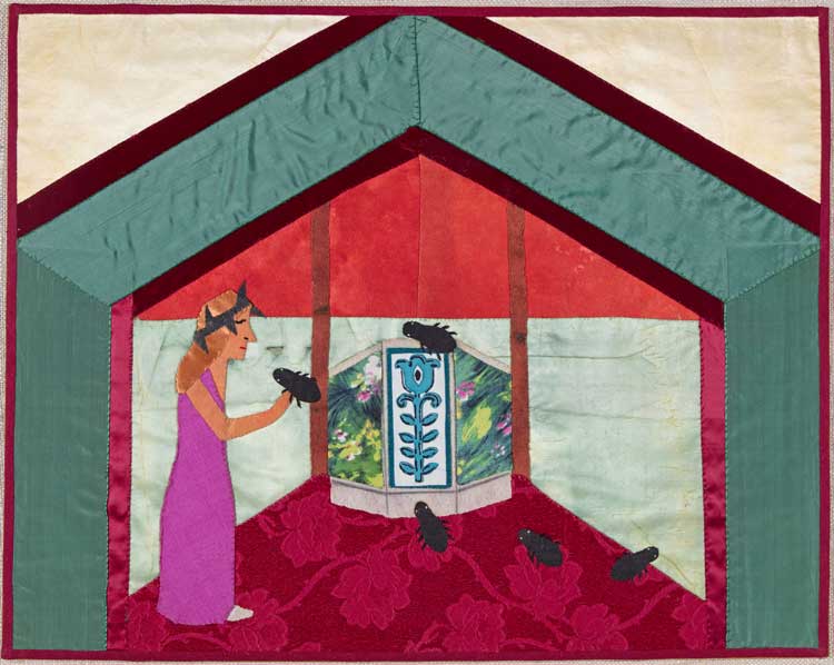 By far the most humorous of the Allen works on display is Beetles Come and Go but Christ Remains Forever (exhibited 1967), showing Jesus in a pink robe, with a crown of thorns, in a room with five black beetles. It is Queen’s response to a remark by John Lennon claiming that the Beatles had become more popular than Jesus. This is her retort saying that her Christ is far more important than any measly beetles. This picture is a beautiful example of how Queen used the trope of a fabric frame to complete the work. Also of note is the inclusion, by each of Queen’s works, of little samplers for visitors to touch and get an idea of the feel of the different textures of materials being used. This is the first time the venue has experimented with creating such a multisensory experience, and I hope it will prove successful.