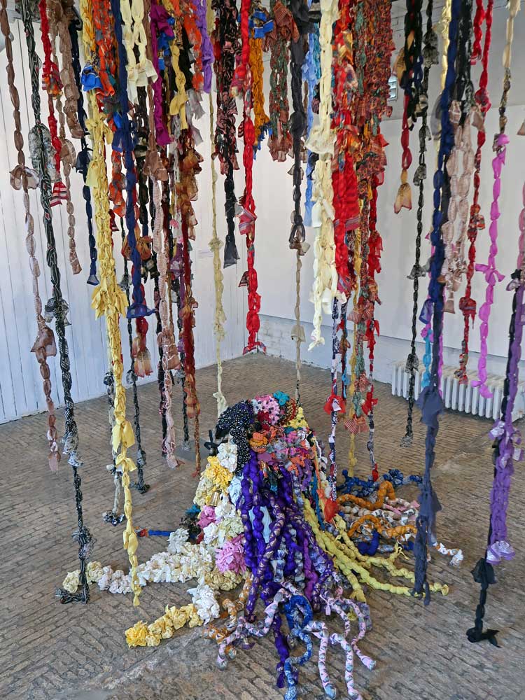 My favourite work, however, is Tridevi: Creator, Preserver and Destroyer (2023) by Saroj Patel. This was inspired by the artist’s experience of being a mother to children with dual heritage and feeling caught between different traditions and backgrounds. Patel, like Queen with her rags, has used strips of sari material to create a large, hanging installation, its colourfully knotted ropes pooling on to the ground, surrounding a central highchair-like object. The Hindu concept of Tridevi refers to the three goddesses Saraswati, Lakshmi and Parvati, who, as a trio, represent the feminine aspects of the Creator, Protector and Destroyer.