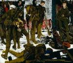 There are too many moving pieces in Truth and Memory to cover here, but it would be an oversight not to mention Eric Kennington’s The Kensingtons at Laventie (1915). Painted in reverse on glass it is a sympathetic portrayal of Platoon No. 7, each weary figure a detailed portrait with a story to tell. Kennington kept a written account of the men featured. On the right stands Corporal Kealey, about to give his orders for the bedraggled company to fall in, while an exhausted underage private lies prostrate in the foreground.1