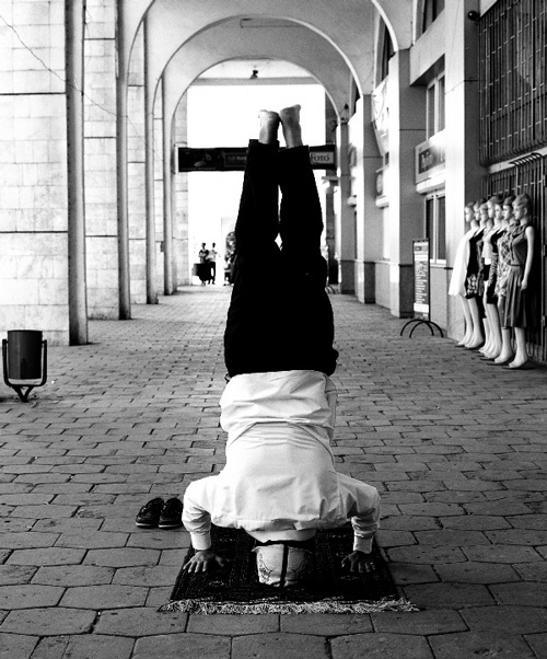 The installations produced for the launch of this residence programme are no exception. Tolondu Toichubaev, who produced the project and funded this first stage, explains: ‘why live on your own in a residence programme? Instead, why not group people together in a collection of dachas – directors, painters, sculptors – in a place where they can exchange and create, for whatever time period they wish? I looked for a long time for the perfect place in the mountains and found Uch Recheck.’1 Eight artists and photographers spent some of 2008 creating the works that would constitute the project’s launch, ranging from texts, videos, photographs, sculptures, performative acts. Talgat Asyrankulov’s ‘I pray to the East, look to the West’, for example, is a wonderful visual summary of this nation’s complex mix of cultural and religious heritage. While the republic is a Muslim state, Islam remains primarily a cultural identity as a component of nation-building. Culturally, Kyrgyz nation-building is strongly Westernizing, resulting from decades of Russian influence and now broader globalization.