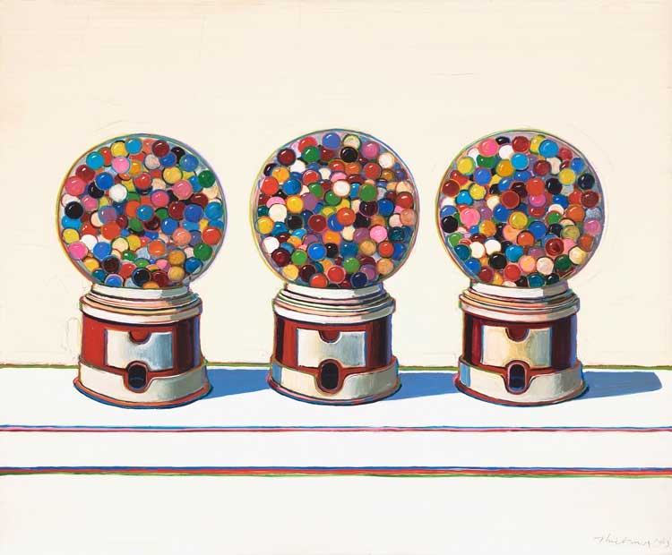 Wayne Thiebaud, Three Machines, 1963. Oil on canvas, 76.2 x 92.7cm. Fine Arts Museums of San Francisco © Wayne Thiebaud / VAGA at ARS, NY and DACS, London 2025. Image: Photo: Randy Dodson, courtesy of the Fine Arts Museums of San Francisco.