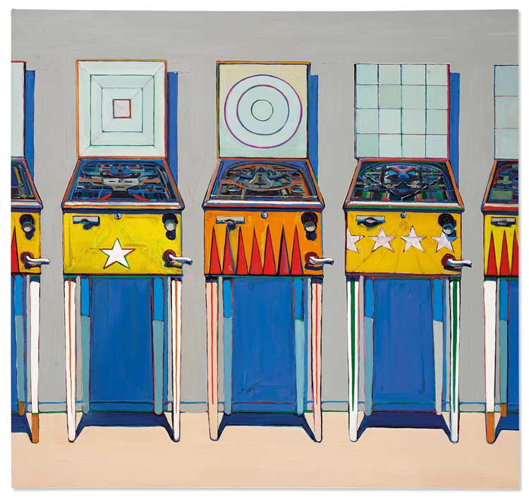 Wayne Thiebaud, Four Pinball Machines, 1962, Oil on canvas, 172.7 x 182.8cm. Private Collection. © Wayne Thiebaud / VAGA at ARS, NY and DACS, London 2025. Image: Courtesy of Acquavella Galleries.