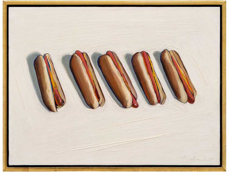Wayne Thiebaud, Five Hot Dogs, 1961. Oil on canvas, 45.72 x 61cm. Private Collection. © Wayne Thiebaud / VAGA at ARS, NY and DACS, London 2025. Photo: John Janca.