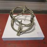 The Gary Tatintsian gallery displays two relatively small models of these trucks and a real-size one. Relatively recently Delvoye abandoned thematic provocation in favour of a formal one: instead of producing and selling excrement, he distorts the form of his objects with such brilliance that their “straight” variants become erased by their more attractive “twisted” counterpart: it is no longer possible to imagine the original without comparing it to Delvoye’s version. The small truck models at Gary Tatintsian’s are so warped – one of them looks like a parallelogram slated in its longitudinal section, and the other is twisted along its horizontal axis. The exhibition also features several car tyres intricately carved with individual patterns and arranged in tasteful configurations. Finally, there are seven shiny oversized “rings” placed in a circle on the gallery floor. The reflection of light off the polished bronze and the curvature of the shapes make it difficult to discern the iconography of the pieces, but, on a closer look, it becomes clear that the curled up objects are actually giant crucifixes, complete with the figure of Christ, however deformed. In this exhibition, then, Delvoye remains faithful to the subversive core of his iconoclastic art. The gallery’s expansive exhibition space allows for an unimpeded exploration of the pieces, which is advantageous for Delvoye, who likes to play with scale to draw attention to the elaborate craftsmanship in his work.