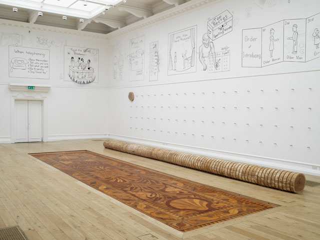 On entering the main gallery space, your eyes immediately focus on the centre of the floor where the wooden floorboards have been removed to reveal a hidden message. But Ondák didn’t create this message. Rather, he has revealed an inscription on the gallery’s original 19th-century marquetry floor, designed by British artist and children’s book creator Walter Crane, that states: “The source of art is in the life of a people.”