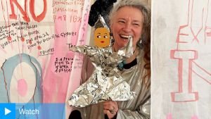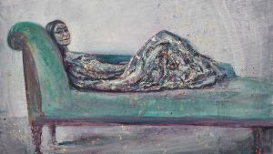 Finch has been described as a jack of all mediums, and with Clouds (Gasherbrum IV,1984) he translates photographs into mosaic. Small square glass tiles lie in rows, each a different shade on a spectrum of subdued blue, grey and white. We are told this work is a representational mosaic of a mountaintop during a mountain-climbing disaster: however, in the absence of the six other mosaics that make up this series, such a reading is not obvious. The subtle colour variety within a repetitious structure evokes Finch’s landmark installation Trying to Remember the Color of the Sky on That September Morning (2014) at the September 11 Memorial Museum, made up of hand-painted rectangles bearing different shades of sky-blue, one for each of the dead. With its uneven surface and roughly cut tiles, Clouds (Gasherbrum IV, 1984)is an abstract work, evoking white noise, but with enough contours and jagged details to catch the wandering eye.